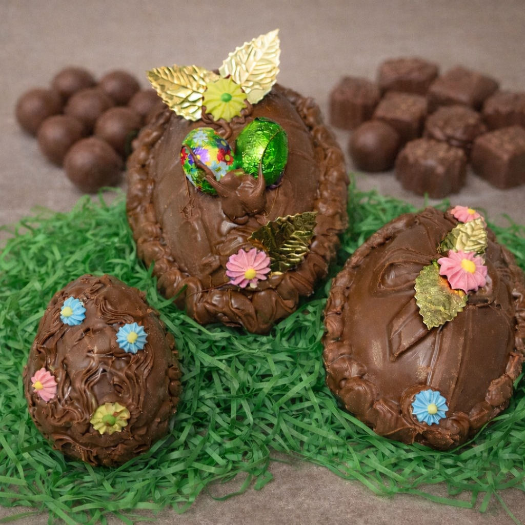 Medium egg measures 3.5 x 4.5 inches filled with six pieces of candy: one milk chocolate foiled Easter egg, two milk chocolate Easter miniatures, one milk chocolate nonpareil, one coconut jelly bean nest and caramel.